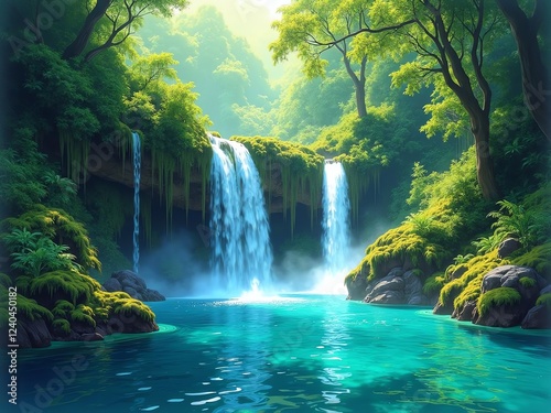 Fototapeta premium A mystical watercolor depiction of a hidden lagoon surrounded by lush jungle foliage, with turquoise waters shimmering under the sunlight, Small waterfalls trickle down moss-covered rocks