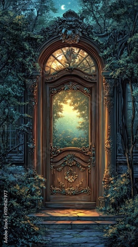 Fototapeta premium A mystical wooden door framed by lush greenery, leading to a glowing forest.