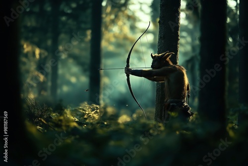 © OMD, Naklejka premium A mythical faun, half-human, half-goat, is depicted in the forest, skillfully aiming a bow and arrow. The scene is set in a dense, lush, green woodland.