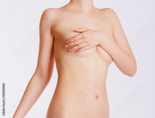 Fototapeta premium A naked female body with a covered breast on a white background. The concept of female breast cancer.