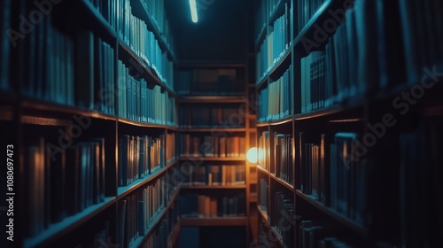 Fototapeta premium A narrow aisle in a library filled with books and illuminated by a warm light.