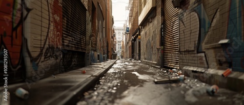 Fototapeta premium A narrow alley decorated with graffiti and litter reveals urban grit and...