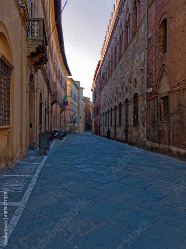 © Dimitrios, Obraz premium A narrow alley in Siena, Italy, framed by aged brick walls and ivy, leading to a sunlit ochre building with arched windows. The scene evokes timeless Tuscan charm and architectural intimacy.