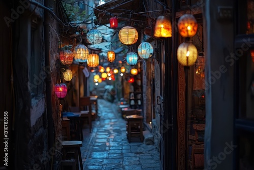 Naklejka premium A narrow alleyway filled with handmade lanterns of different shapes and colors. The glow of the lights gives the street a warm and cozy feel