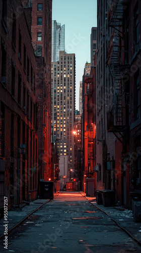 Fototapeta premium A narrow alleyway in the city, bathed in the warm glow of dusk, with towering...