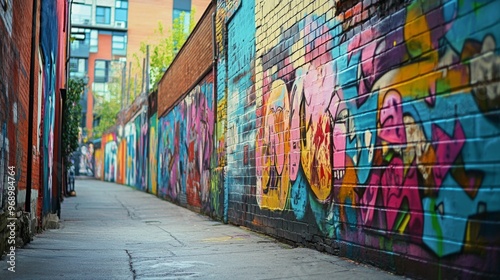 Fototapeta premium A narrow alleyway lined with colorful graffiti art on brick walls.