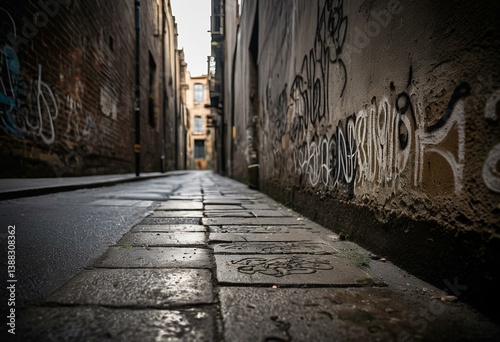 © Daniel, Obraz premium A narrow alleyway with graffiti on the walls.