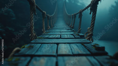 Fototapeta premium A narrow, ancient wooden walkway with irregular planks and frayed ropes,...