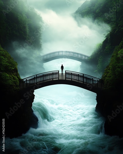 © Pattypatt, Fototapeta premium a narrow bridge above a turbulent river, with a lone figure crossing, symbolizing fear and courage