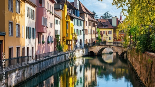 © Theeranan, Fototapeta premium A narrow canal in a European city, lined with colorful historic buildings and stone bridges.