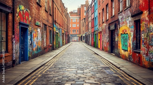 Fototapeta premium A narrow cobblestone street lined with colorful graffiti-covered buildings.