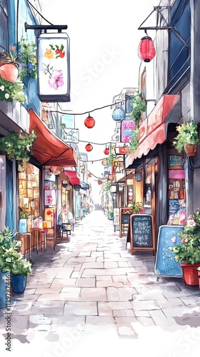 © hamzahalderad, Fototapeta premium A narrow, cobblestone street lined with shops and decorated with red lanterns.