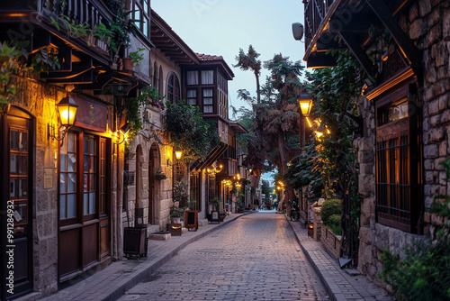 © Aisyaqilumar, Fototapeta premium A narrow cobblestone street with old buildings along it. A quiet dusk.
