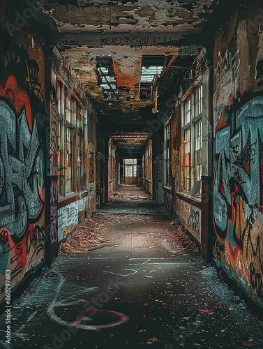 © medalinebow, Fototapeta premium A narrow, dark alley winds through aschool building, its stone walls adorned with faded graffiti