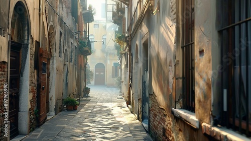 Fototapeta premium A narrow, empty alleyway bathed in the soft, even light of the early morning