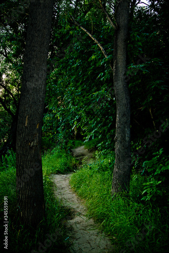 Fototapeta premium A narrow forest path winds through tall trees in a dark forest. The dense foliage of the trees does not let in daylight and therefore it is dark around.