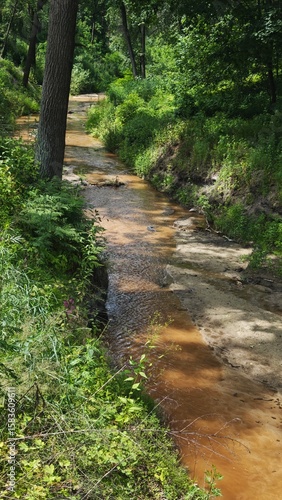 © Olena, Fototapeta premium A narrow forest river flowing through green vegetation and trees with clear sandy banks