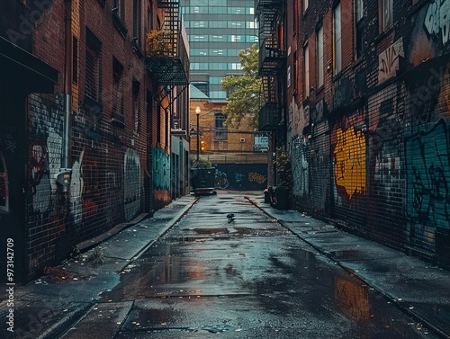 Fototapeta premium A narrow, graffiti-covered alleyway in a city, with a wet pavement and a lone...