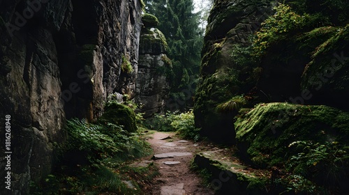 © Jojo*, Obraz premium A narrow hiking trail winding through a dark and moody moss covered rock canyon.