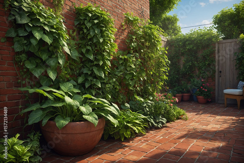 Fototapeta premium A narrow home garden space featuring climbing vines, large-leaf foliage, and colorful potted plants along a brick pathway gives a vibrant and organized feel, captured in high-resolution