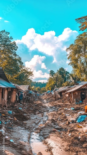 © Trionorejo, Obraz premium A narrow, muddy path lined with makeshift shelters under a bright sky.