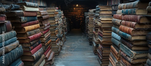 Fototapeta premium A narrow passage lined with shelves of old books, creating a cozy reading...
