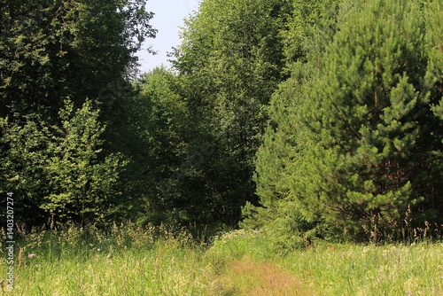 Fototapeta premium a narrow path in a dense deciduous forest on a sunny summer day