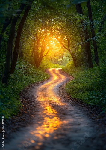 © Warakorn, Obraz premium A narrow road meandering through a dense enchanted forest with soft light peeking through leaves