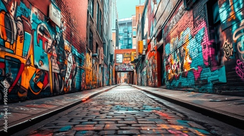 Fototapeta premium A narrow street with graffiti covered brick walls and cobblestone pavement.