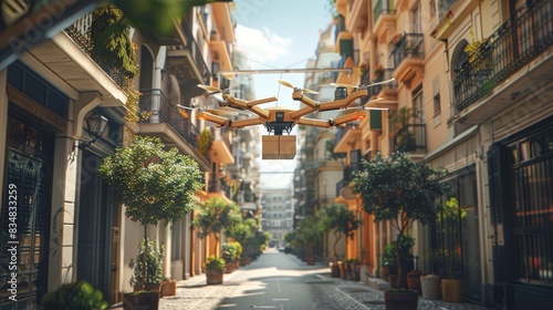 © tinnakorn, Fototapeta premium A narrow, sun-drenched street lined with charming buildings, a delivery drone hovering overhead. The image evokes a sense of peaceful urban life.