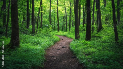 Fototapeta premium A narrow trail cutting through a lush, green forest, inviting a peaceful walk...