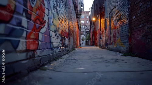 Fototapeta premium A narrow urban alleyway adorned with vibrant graffiti, illuminated by streetlights, showcasing the evening city atmosphere