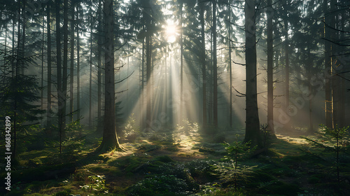 Fototapeta premium A natural forest of spruce trees, the sun's rays through the mist create a mystical atmosphere