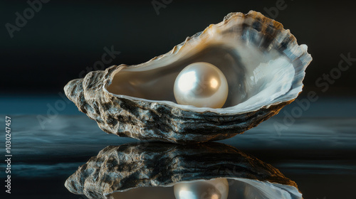 © Suphawan, Naklejka premium A natural pearl nestled in the soft folds of an oyster shell, placed on a mirror surface that reflects both the pearl and the shell for an elegant, artistic effect.