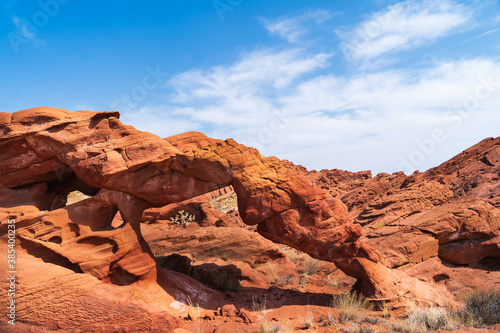 © enyo, Fototapeta premium A natural sandstone arch in a red desert landscape under a clear blue sky with scattered clouds.