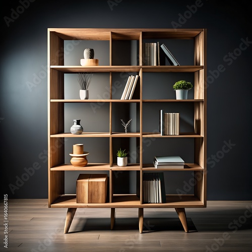© rakib, Fototapeta premium a natural wood bookshelf with mid century mod.jpg
