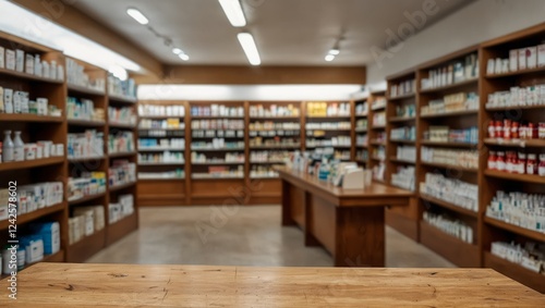 © SR Production, Obraz premium A natural wooden table with ample copy space in the foreground, surrounded by the warm