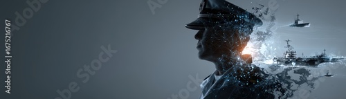 Fototapeta premium A navy officer silhouette surrounded by AI holographic elements, depicted in...