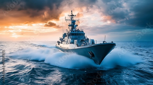 Naklejka premium A navy ship cuts through the water with a beautiful sky in the background.