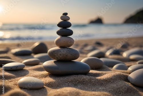 Fototapeta premium A neat stack of smooth pebbles on a sandy beach, showcasing natural tones of gray and beige. The tranquil scene features a blurred horizon and soft light, evoking calm and minimalist balance.