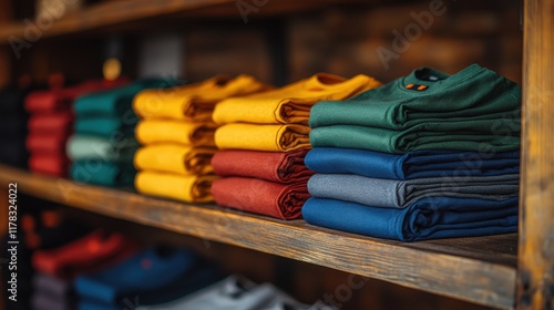 © Rosnani, Naklejka premium A neatly arranged display of colorful folded shirts on wooden shelves in a retail setting.