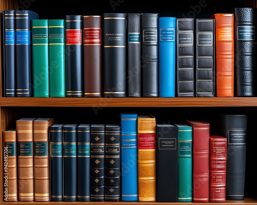 Fototapeta premium A neatly organized shelf filled with colorful hardcover books, showcasing...