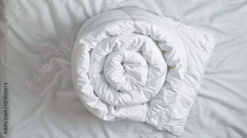 Obraz premium A neatly rolled white comforter on a soft bed, capturing the essence of comfort and cleanliness, perfect for bedroom product showcases and home decor inspiration.