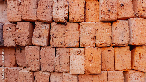 Fototapeta premium A neatly stacked pile of red clay bricks, symbolizing construction and urban development