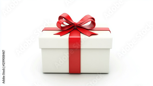 Fototapeta premium A neatly wrapped gift in a white box adorned with a vibrant red ribbon and bow, presented against a pristine white backdrop, suggesting celebration and joy.
