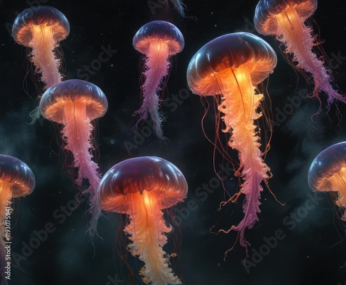 Fototapeta premium A nebulous mass of colored jellyfish suspended in a dark and turbulent medium, imbuing the scene with an air of turmoil, ethereal mist, jellyfish smoke