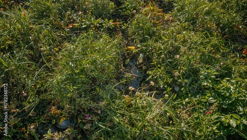 © vxnaghiyev, Fototapeta premium A neglected plot overrun by vegetation, highlighting potential for restoration