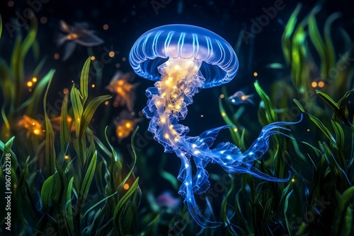 Fototapeta premium A neon blue jellyfish gliding gracefully through clear waters with bioluminescent creatures in the background