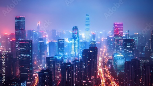 © B 7 YOU, Obraz premium A neon cityscape at night with many skyscrapers and tall buildings.