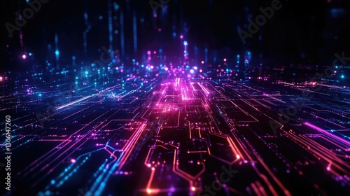 Fototapeta premium A neon cyber grid 3D abstract background with glowing circuit-like patterns...